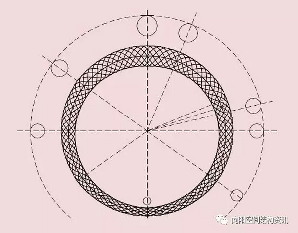 (d)建立长度方向的直线到圆弧线的几何变换,将上脊线 变换为直径为 125m 的整圆,即将 80个网格的总长映射成 360 度的圆弧,得到环状网格。此时圆环各截面都是正圆,这种关系很便于制造和安装分块。